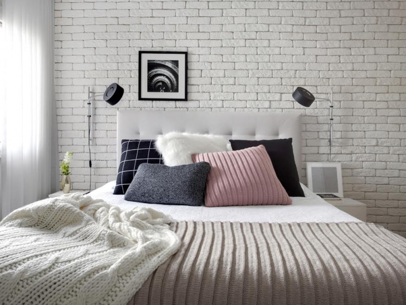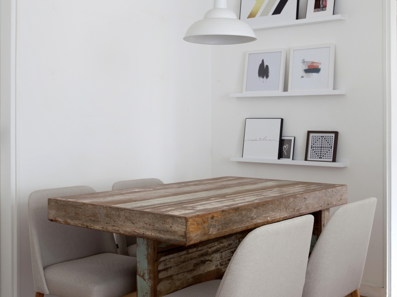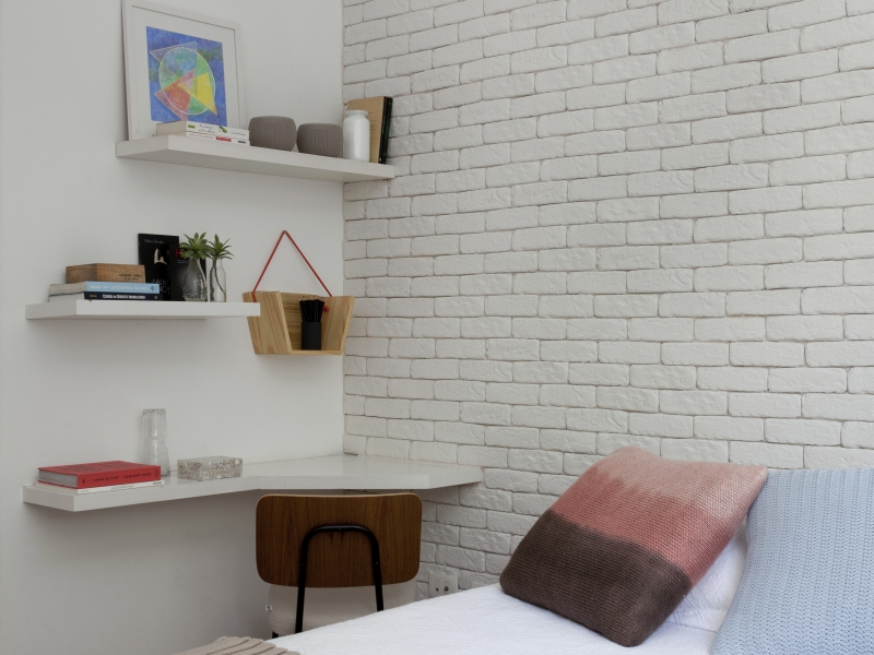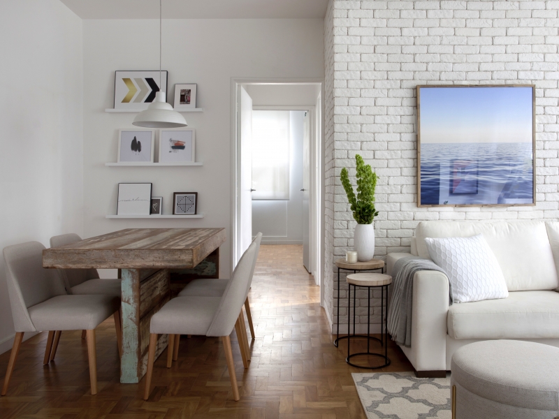 Na parede da sala atrás do sofá foi preenchido com o revestimento de tijolinho para tirar a frieza da parede, o mesmo com o quarto de casal, já que ela não queria usar cabeceira. Na sala de jantar, como a mesa já era de madeira de demolição, a ideia foi apoiar os quadros preto e branco sobre prateleiras para deixar o ambiente mais neutro, dando destaque para a sala que está totalmente integrada.